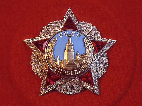 苏联卫国战争勋章的高端款,非“胜利”勋章莫属。此勋章只颁授给胜利完成一个或数个方面军战役并从根本上改变战役走向的苏军统帅。