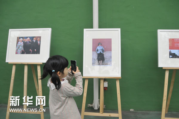 以为小朋友在中丹建交画册前拍照 。 新华网 张艺 摄