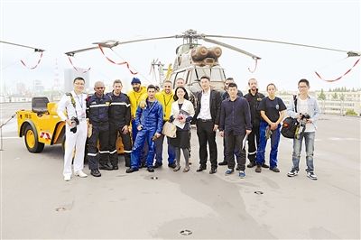 在法国美洲豹直升机前,“迪克斯莫德”号的官兵与中国观众合影。 崔博翔摄