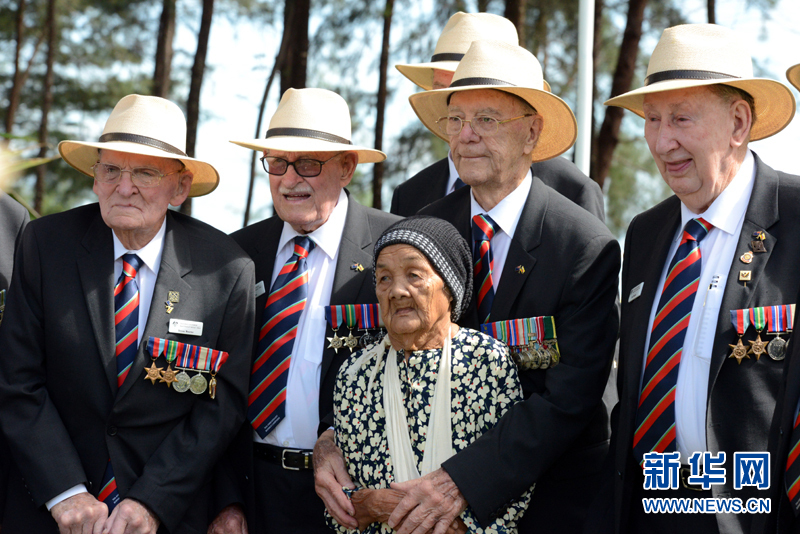 澳大利亚二战老兵10日上午来到文莱摩拉海滩,出席1945年澳大利亚军队两栖登陆纳闽岛和文莱摩拉海滩,从日本占领军手中解放婆罗洲70周年的纪念活动并向纪念碑献花。文莱二战期间幸存者(中)与澳大利亚老兵合影。新华网记者 郑捷 摄