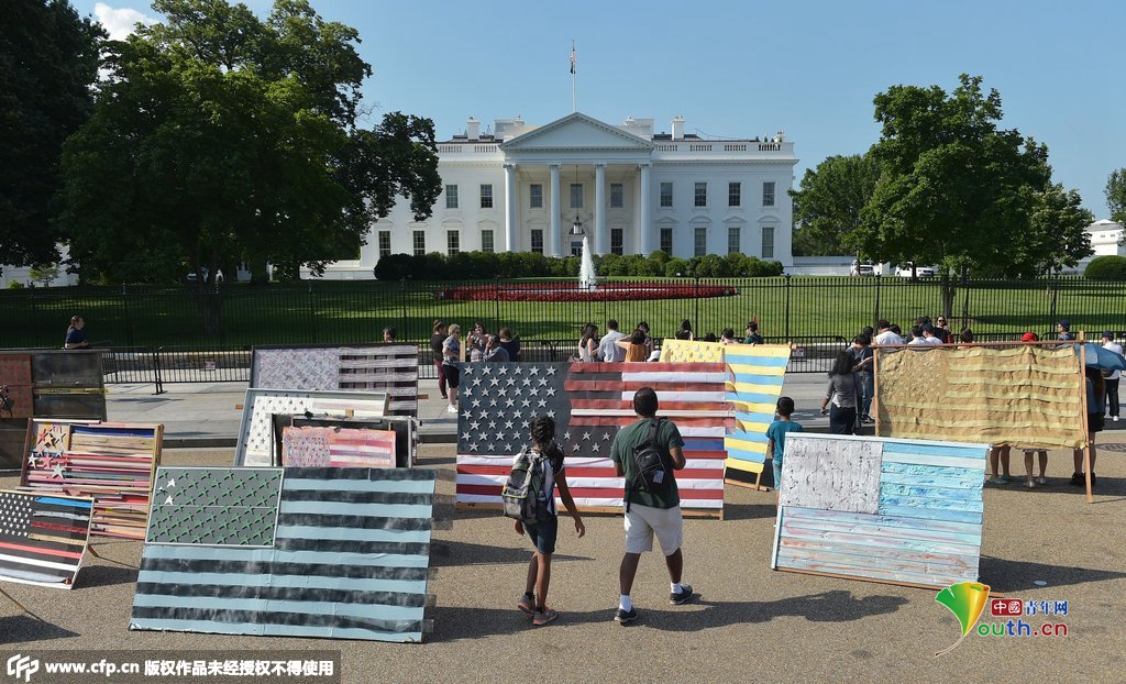 当地时间2015年6月14日,美国华盛顿,白宫外展出50面旗帜,庆祝美国国旗日到来,这些旗帜是纽约州斯塔顿岛一个组织设置的。 (供图:MANDEL NGAN/CFP)