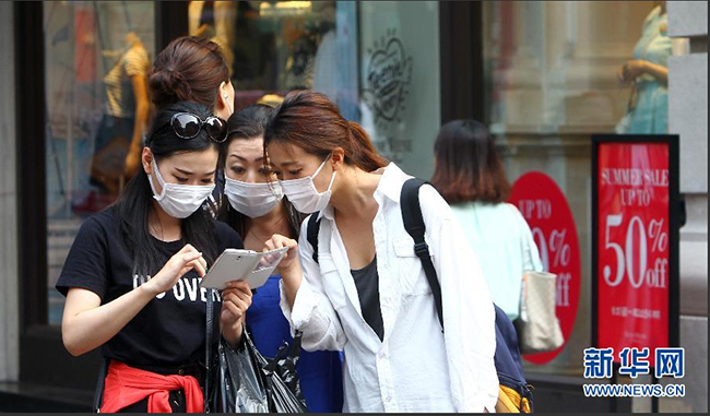 6月16日,在韩国首尔,人们在明洞商业区购物。根据韩国旅游发展局最新数据,逾十万外国游客因中东呼吸综合征(MERS)疫情取消赴韩旅行。 新华社记者姚琪琳摄