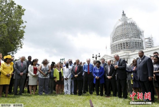 当地时间2015年6月18日,美国华盛顿,美国国会议员在国会大厦前为黑人教堂枪击案遇难者默哀。