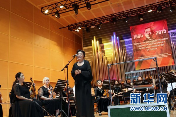 当年救济冼星海的哈萨克斯坦音乐家拜卡达莫夫女儿拜卡达莫娃在音乐会上回忆当年冼星海在阿拉木图的岁月。(新华社记者周良摄)