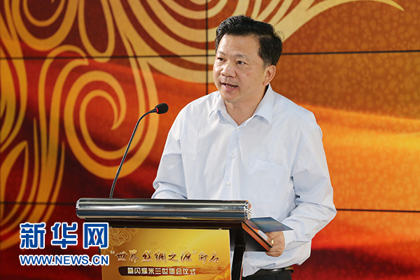 6月25日,新华社副社长慎海雄在仪式上致辞。当日,“世界丝绸之源”命名暨闪耀米兰世博会仪式在北京举行。经专家评审,中国湖州钱山漾文化遗址因发现了世界上最早的绸片而被正式命名为“世界丝绸之源”。同日,来自钱山漾的两件丝绸精品,也将随“中国梦 丝路梦”互联互通丝路行考察团,跨越亚欧万里长路,亮相米兰世博会。新华社记者邢广利摄