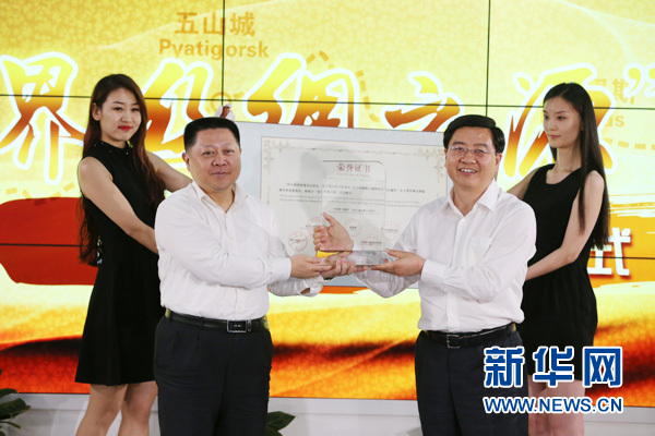6月25日,国务院副秘书长、国务院参事室主任王仲伟(左)向湖州市市长陈伟俊(右)授予“世界丝绸之源”纪念牌。当日,中国湖州钱山漾遗址获“世界丝绸之源”命名仪式在北京举行。来自钱山漾的两件丝绸精品同日将随“中国梦 丝路梦”互联互通丝路行考察团,跨越亚欧万里长路,亮相米兰世博会。记者 邢广利 摄