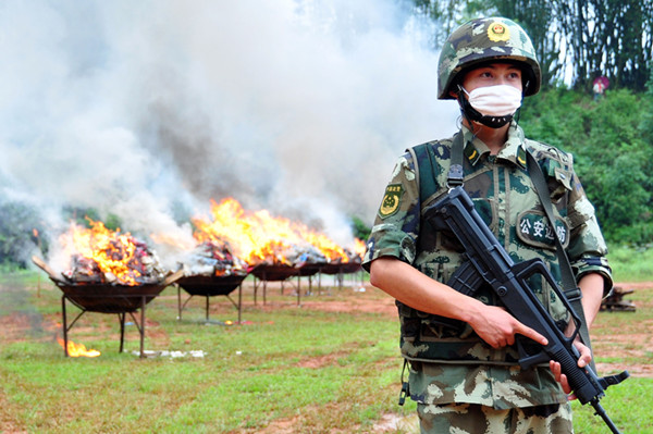 2012年6月26日,一名边防战士在公开销毁毒品现场警戒。