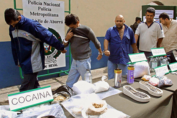 哥伦比亚警方在麦德林市向公众展示一批缴获的毒品可卡因和毒贩。