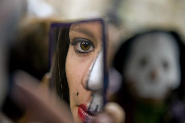 2011年11月27日,在墨西哥首都墨西哥城,一名女孩将自己的面孔化成骷髅模样,准备参加一次反对毒品的游行示威活动。