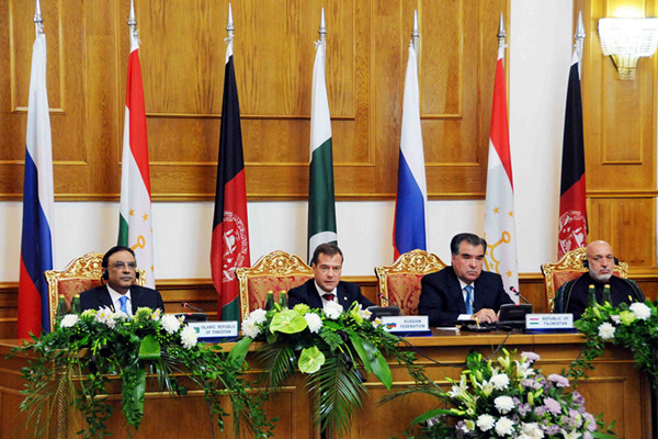 2011年9月2日,在塔吉克斯坦首都杜尚别,塔俄巴阿四国总统讨论加强各国在地区安全、反恐、缉毒、经贸等领域的合作问题。