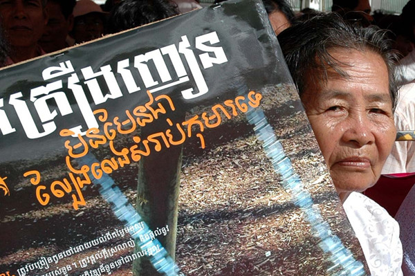 2007年6月26日,在柬埔寨首都金边举行的焚毁毒品活动上,一名妇女手持说明毒品危害的标语牌。