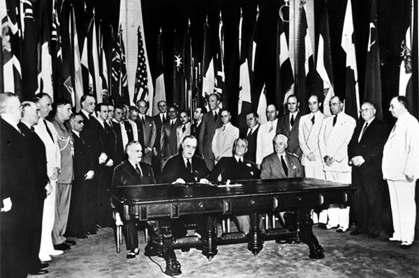 《联合国宪章》拟订于第二次世界大战行将结束之际。1942年1月1日,正在对德、意、日法西斯作战的中、美、英、苏等26国代表在华盛顿发表《联合国宣言》,强调在打败共同敌人后建立一个拥有广泛普遍安全制度的世界秩序,并第一次采用“联合国”一词。图为当日26国代表在华盛顿签署《联合国宣言》。