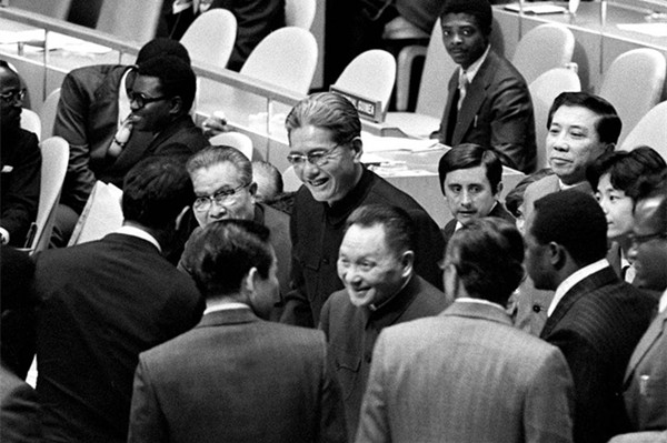 1974年4月,中国代表团团长、国务院副总理邓小平(前中)在联合国大会第六届特别会议上发言后受到许多国家代表的祝贺。(新华社记者钱嗣杰摄)