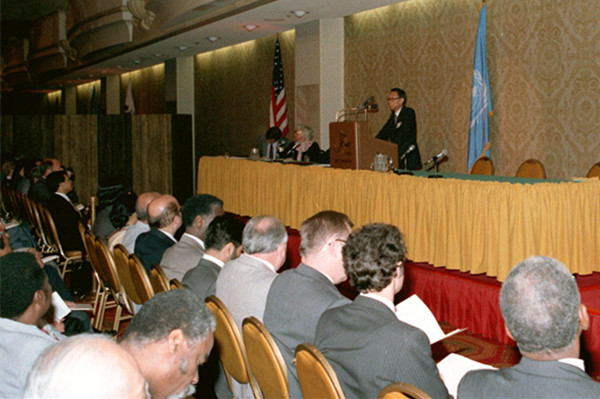 1985年6月24日,《联合国宪章》签署40周年纪念大会美国旧金山举行。图为中国常驻联合国代表凌青(林则徐的第五代孙)在纪念大会上发言。(新华社记者周慈朴摄)