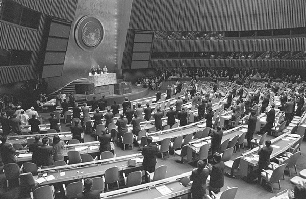 1995年10月22日至24日,联合国隆重举行成立50周年特别纪念大会。这次盛会是联合国历史上规模最大、最为隆重的庆典,包括92名国家元首和42名政府首脑在内的202个国家和组织的领导人到会发言。会议通过了《联合国50周年纪念宣言》。图为与会代表在大会结束时起立鼓掌祝贺宣言通过。