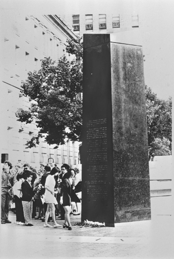 1995年6月26日,在《联合国宪章》签署50周年之际,新落成的联合国宪章纪念碑在美国旧金山联合国广场揭幕。这是揭幕后,来自世界各地的青少年向纪念碑献花。(新华社记者谢云安摄)