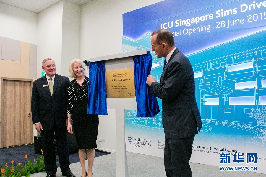 6月28日,澳大利亚总理托尼·阿博特在詹姆斯库克大学新加坡校区新校区揭幕仪式上致辞。当日,阿博特走访澳大利亚詹姆斯库克大学新加坡校区,为该大学新校区揭幕。这是阿博特任内首次访问新加坡。此次访问主要目的是庆祝新澳建交50周年。实习记者蒋琰