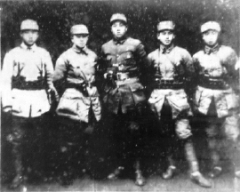 苏中军区海防纵队司令员陶勇(左二)、政委吉洛(姬鹏飞,中)与部分海防指战员合影。(资料图片)
