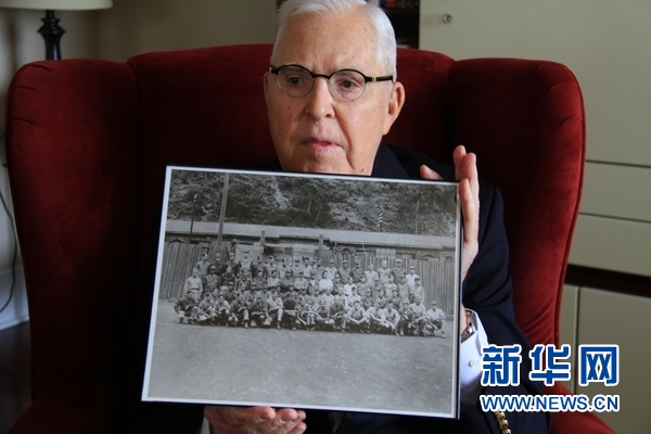 2015年7月3日,麦克唐奈在多伦多的住所内接受记者采访,这是他向记者展示1945年9月15日加拿大战俘在日本被解救时的照片。新华社记者 晏忠华摄