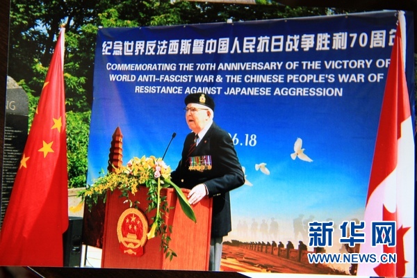 麦克唐奈向记者展示的照片显示,2015年6月18日他受邀参加中国驻加拿大使馆在渥太华的香港保卫战纪念碑前举行的纪念活动。新华社记者 晏忠华摄