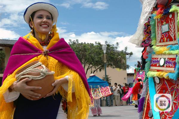 图为在赤道纪念碑附近,一名美女身着传统的民族服装参加活动。