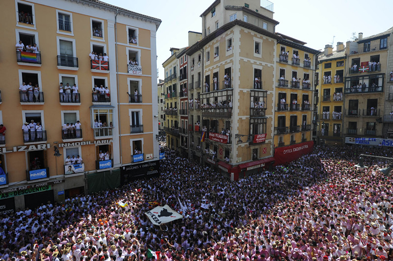 7月6日中午,以惊险、刺激、狂放不羁著称的潘普洛纳奔牛节拉开帷幕。在市政府乐队的伴奏下,人们踏着活泼的霍塔舞曲节拍,从四面八方向市政厅广场而来。几乎所有人都身着白色衣裤,系红色腰带。12时整,两声礼炮和大教堂长达数分钟的钟声与人们的高喊声“万岁,圣费尔明”融为一体,震耳欲聋。狂欢开始了。人们拿着葡萄酒、啤酒和各种酒精饮料互相泼洒。