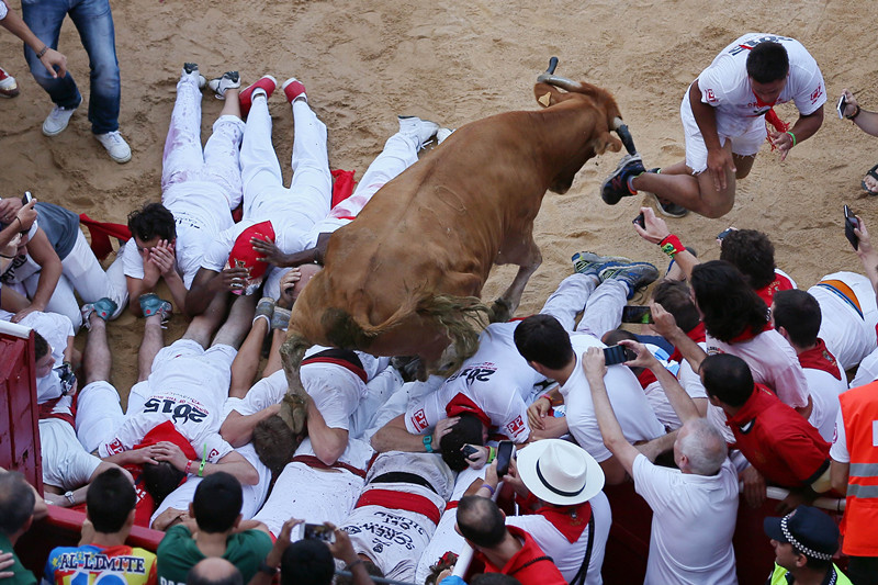 年年奔牛,年年都有人受伤,甚至有人无辜丧命。但是,如果是在与野性十足的牛同路奔跑时受伤或丧命,人们好像觉得很正常、很自豪。美国著名作家海明威的小说《太阳照样升起》就是以潘普洛纳的奔牛为背景,道出了人们在斗牛场上的生死观。