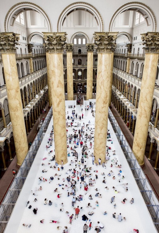 当地时间2015年7月7日,美国华盛顿,美国国家建筑博物馆回收了1百万多个白色半透明塑料球,铺满整个大厅,形成独特的白色休闲“沙滩”。这些圆球是由可回收材料制成的,展览将从现在起一直持续到9月7号。这个项目的设计方是布鲁克林一家叫作Snarkitecture的工作室,工作室为这个项目起名叫作“The Beach”,设计师说,这样做既为了保护环境,也为了让游客在炎热的夏天不用到海边就可以享受舒适的“沙滩”。