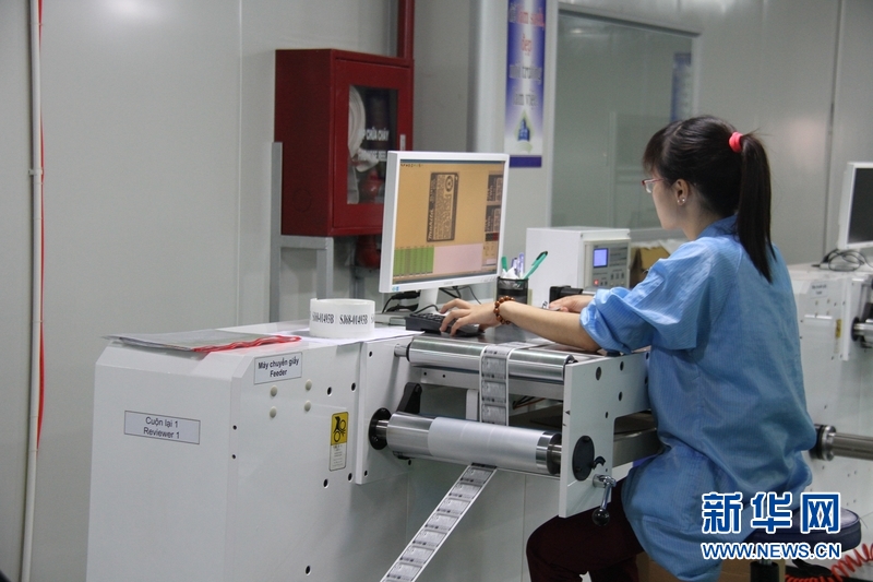 7月9日,工人们在越南北江省云中工业园区内融欣电子股份有限公司的车间内作业。该公司为中资企业,主要生产电子产品的标签。云中工业园区距离越南首都河内约40公里,由中资企业富华责任有限公司于2013年开始开发和建设。目前前三期项目共30栋已经投入运营,占地16.5万平方米,共有13家企业入驻,其中有8家为中资企业。第四、五期项目正在施工中,预计还将建成50栋左右的厂房。新华社记者 乐艳娜摄