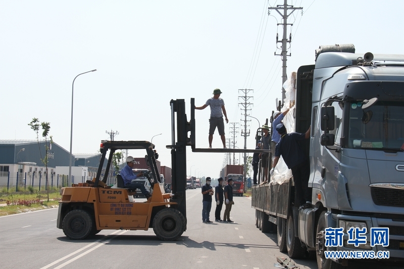 7月9日,在越南北江省云中工业园区,工人们正在各种运输工具上紧张作业。云中工业园区距离越南首都河内约40公里,由中资企业富华责任有限公司于2013年开始开发和建设。目前前三期项目共30栋已经投入运营,占地16.5万平方米,共有13家企业入驻,其中有8家为中资企业。第四、五期项目正在施工中,预计还将建成50栋左右的厂房。新华社记者 乐艳娜摄