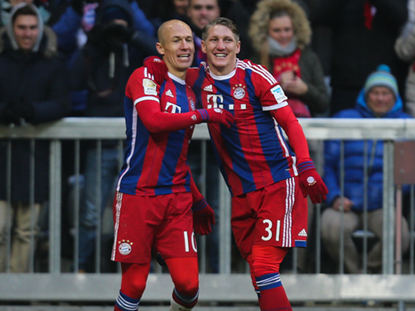拜仁球员施魏因施泰格(右)与罗本在比赛中庆祝进球(菲利普·鲁伊兹摄)