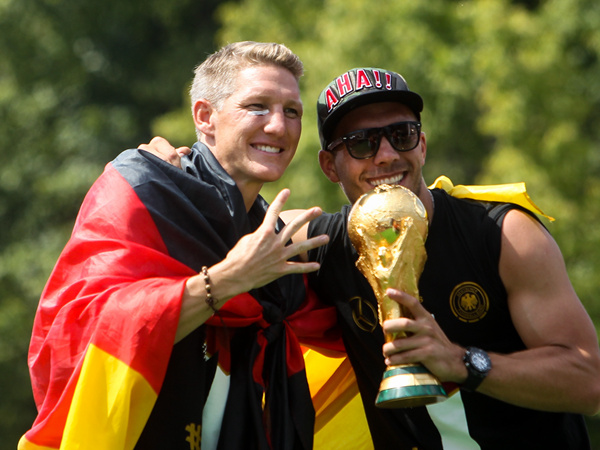 施魏因施泰格(左)与国家队队友波多尔斯基庆祝世界杯夺冠(新华社记者张帆摄)