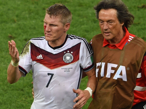 施魏因施泰格(左)在与阿根廷进行的巴西世界杯决赛中脸部受伤(新华社记者李尕摄)