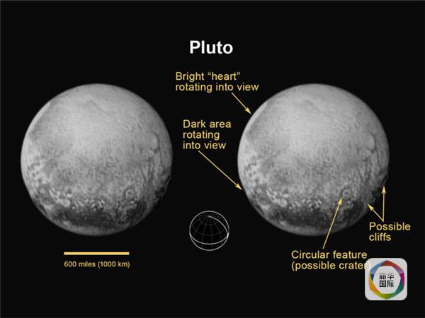 以往冥王星的最佳照片来自“哈勃”望远镜,照片中那些像素化斑点如果是陆地,那么将在“新视野”拍到的照片中可见。本月8日,NASA接到“新视野”传回的冥王星照片显示,这颗褐色星球上有一个巨大的桃心形明亮区域,宽度可达20000公里,还有一条巨大“鲸”形阴影。
