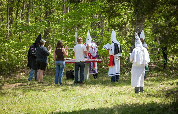 《每日邮报》网站公布的纪录片截图画面显示,几十名“传统美国骑士”的男女成员,身着传统三K党白袍,头套面罩,围在一个插在空地上的巨型木头十字架四周。十字架高9米,在黑夜里燃着熊熊烈火,伴随着成员们的吟唱……