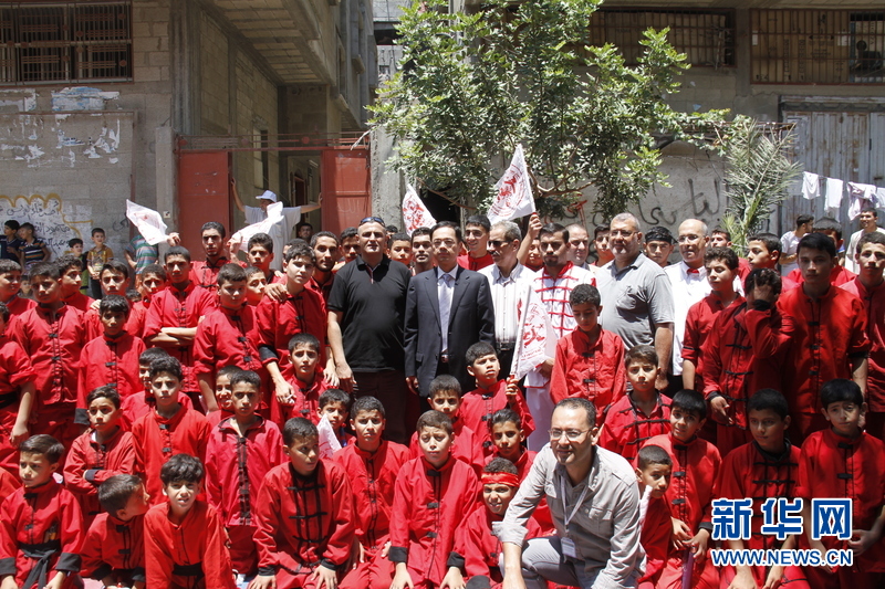 陈兴忠与加沙“大虎”武术学校师生合影。这所学校位于加沙地带东北部,条件相当简陋。说是学校,其实就是街道边一处简易的平房,门前就是练习场地。加沙地带共有十几所武术学校,大小规模不等,都面临师资力量严重不足的问题。新华社记者 刘立伟 摄