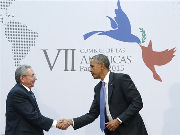 今年4月11日,奥巴马和劳尔·卡斯特罗在巴拿马出席美洲国家首脑会议期间举行会晤。这是近半个世纪以来,美古两国领导人首次正式会晤。
