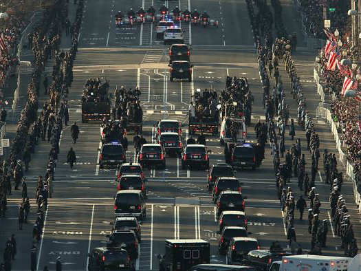 为了赶往会场,只好绕路腿儿着,但走到一半发现被全都堵死了。其实,在彻底封路前,笔者已经成功冲到了路中央,却还是被拦下。和安保人员理论几句强调赶着去会场,解释着“已经走到路中了,过到对面和退回原处的时间是一样的,并不妨碍”云云,可面对总统的安保,就像撞上了铜墙铁壁,最终被强令退回到人行道上。眼看着一条10几米宽的马路,两秒钟就过去了,却变成了“世界上最远的距离”。足足等了30分钟,才见到开道的摩托车队呼啸而过,再过了许久,奥巴马的车队才姗姗露面。