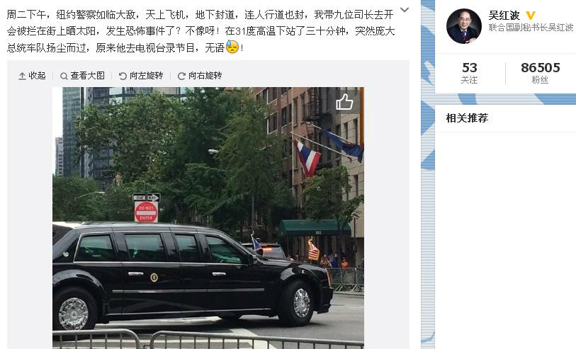 这不,连联合国副秘书长吴洪波都忍不住在微博上吐槽:“周二(22日)下午,纽约警察如临大敌,天上飞机,地下封道,连人行道也封,我带九位司长去开会被拦在街上晒太阳,发生恐怖事件了?不像呀!在31度高温下站了三十分钟,突然庞大总统车队扬尘而过,原来他去电视台录节目,无语!”