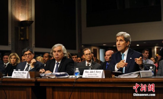 图为克里与能源部长莫尼兹(中)、财长雅各布?卢(左)共同出席听证会。 中新社发 张蔚然 摄