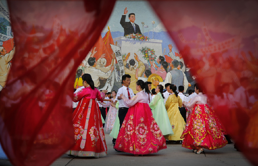 当地时间2015年7月27日,朝鲜平壤,朝鲜人民庆祝朝鲜解放战争胜利62周年,学生们在金日成发表演说的壁画前翩翩起舞。