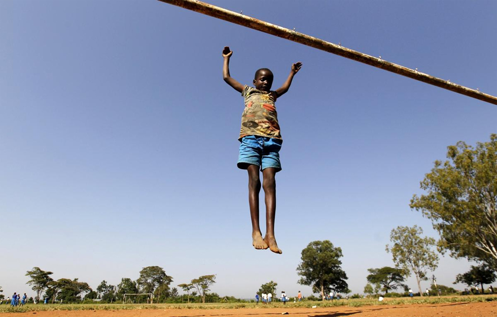 7月16日,位于肯尼亚首都内罗毕西部科盖洛村的奥巴马参议员小学(Senator Obama),一名男孩正趁着课间休息时玩耍。(网页截图)