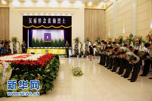 在悲恸的哀乐声中,参加告别仪式的全体人员肃立,向张楠烈士默哀三分钟。悼词简要介绍了张楠烈士生平,并称赞他是有灵魂、有本事、有血性、有品德的新一代革命军人,是献身警卫事业、建设精锐之师的杰出代表。