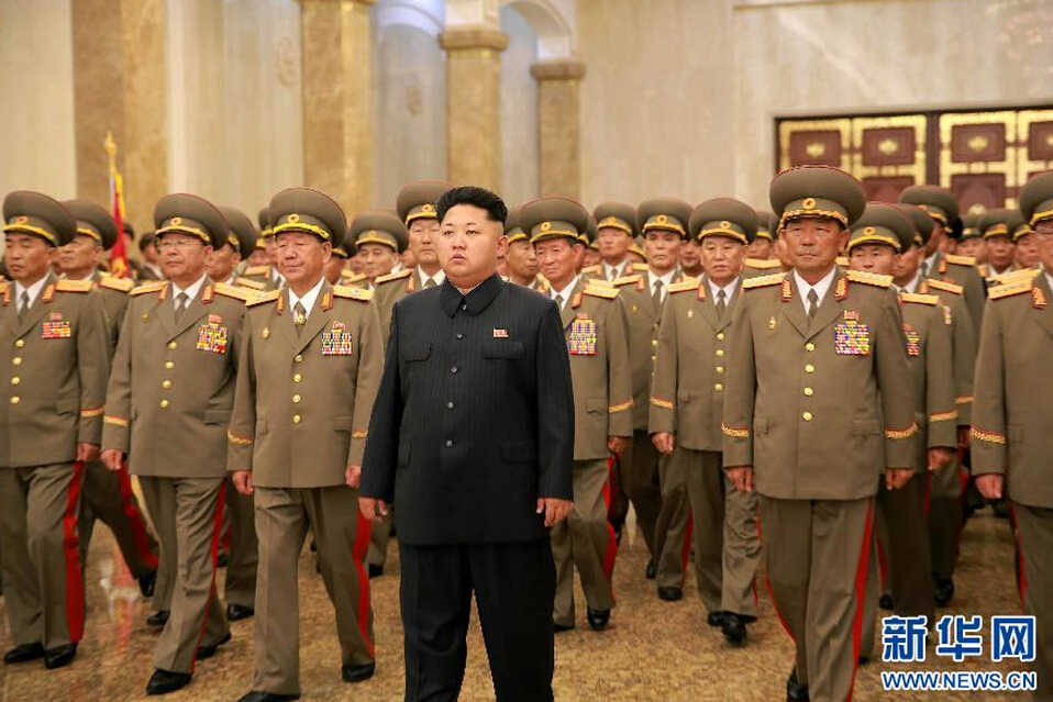 朝鲜最高领导人金正恩(中)于27日零时前往安放朝鲜已故领导人金日成和金正日遗体的锦绣山太阳宫进行参谒,纪念朝鲜祖国解放战争胜利62周年。朝鲜人民军陆军、海军、航空与防空军仪仗队和朝鲜工农赤卫队成员向金日成、金正日雕像敬礼。金正恩和朝鲜人民军官兵向雕像敬献花篮并鞠躬致敬。新华社/朝中社