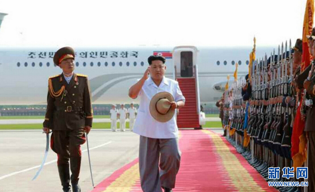 当地时间2015年7月30日,朝鲜元山,金正恩在机场检阅军队。据朝中社报道,在《朝鲜战争停战协定》签署62周年之际,朝鲜航空和防空部队官兵在位于元山的葛麻机场举行战斗飞行技术大会,朝鲜最高领导人金正恩赴现场指导。