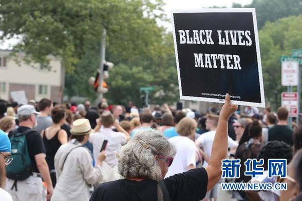 新华网北京8月10日电 来自全美各地的抗议人士8月9日聚集在美国密苏里州圣路易斯县弗格森市举行游行集会,纪念黑人青年迈克尔·布朗被枪杀一周年。