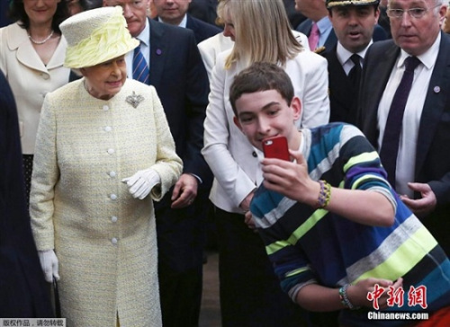 去年女王出访北爱尔兰时,就被一名大胆男孩“蹭合影”。这名男孩举起手机自拍时,女王也镇定自若地看向镜头,颇给面子。在保安人员呵斥后,男孩依旧镇定自若,再次凑过去换个角度与女王合影。