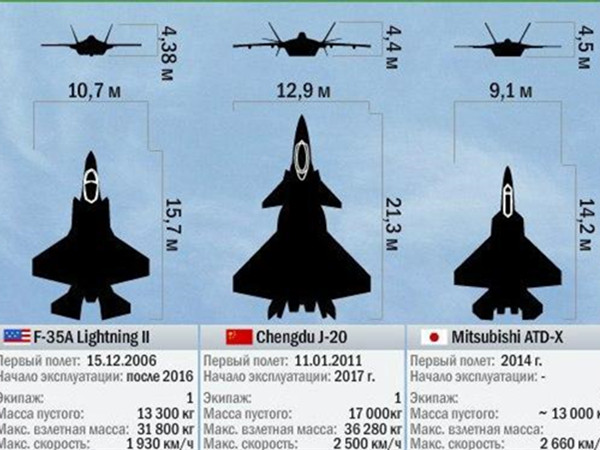 (美国F-35,中国歼-20,日本“心神”大小对比)