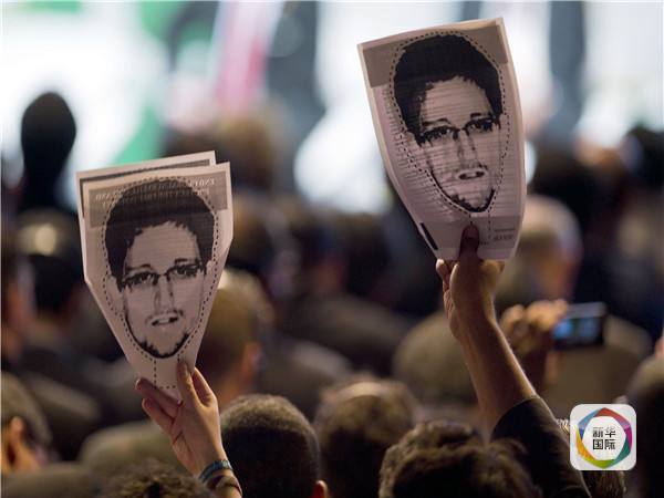 图为去年4月在巴西举行的全球互联网治理大会上,与会者手拿印有斯诺登头像的图片。(图片来源:新华/法新)