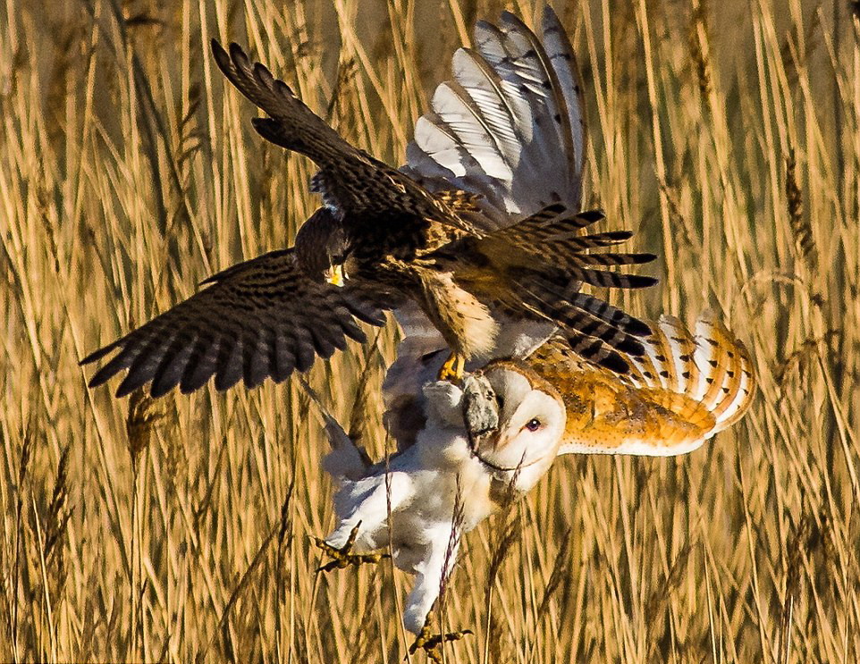 据英国《每日邮报》8月16日报道,近日,在英国英格兰北部的诺森伯兰郡,一名野生动物摄影师拍下了一场激烈的仓鸮茶隼争食大战。